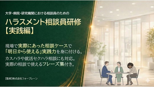 本研修では、大学をはじめとする教育研究機関等におけるハラスメントの相談事例をケーススタディとして取り上げ、「相談員としてどのように対応すべきか」受講者のみなさんに考えていただきながら、演習を通じて体感的に対応方法を習得いただきます。