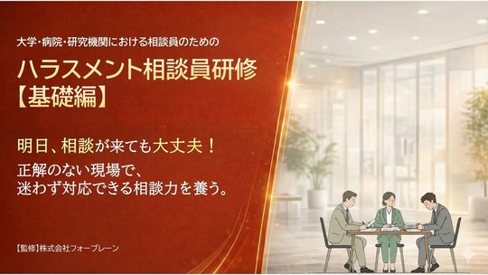 ハラスメント相談員としての基本姿勢から実際の相談対応までを、基礎編・実践編の2本で段階的に学べる研修です。