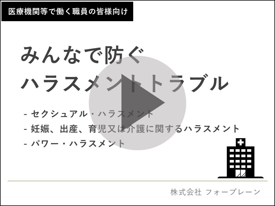 医療機関で発生した具体的なハラスメントトラブルの事例をもとに、「セクシュアルハラスメント」、「妊娠・出産・育児又は介護に関するハラスメント」、「パワーハラスメント」の定義や、トラブルを防ぐための方法について学んでいきます。