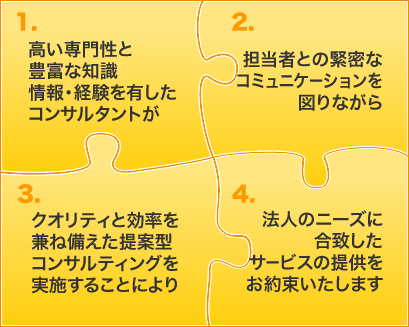 各法人のご担当者の皆さまの「WANT」を的確にとらえ、型通りの回答やサービスを押し付けることなくカスタムメイドなご提案によって、皆さまの抱えている「WANT」の実現につなげます。